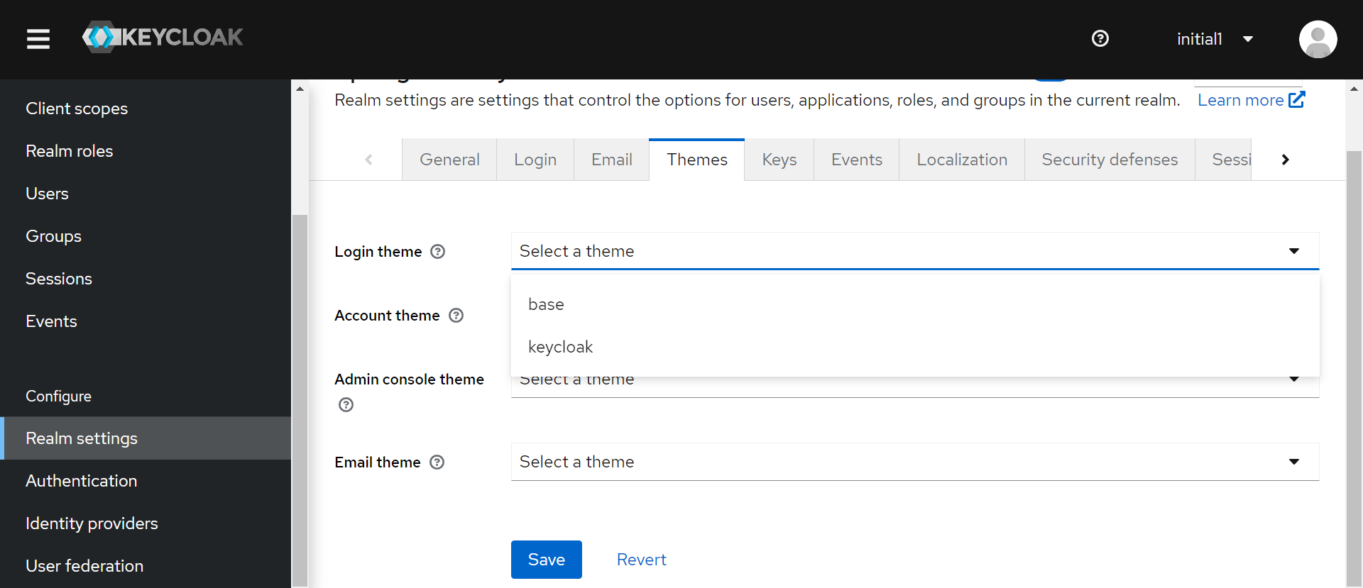 然后,我们将转到管理控制台,输入initial1/zaq1!QAZ凭据并转到我们realm的主题选项卡: