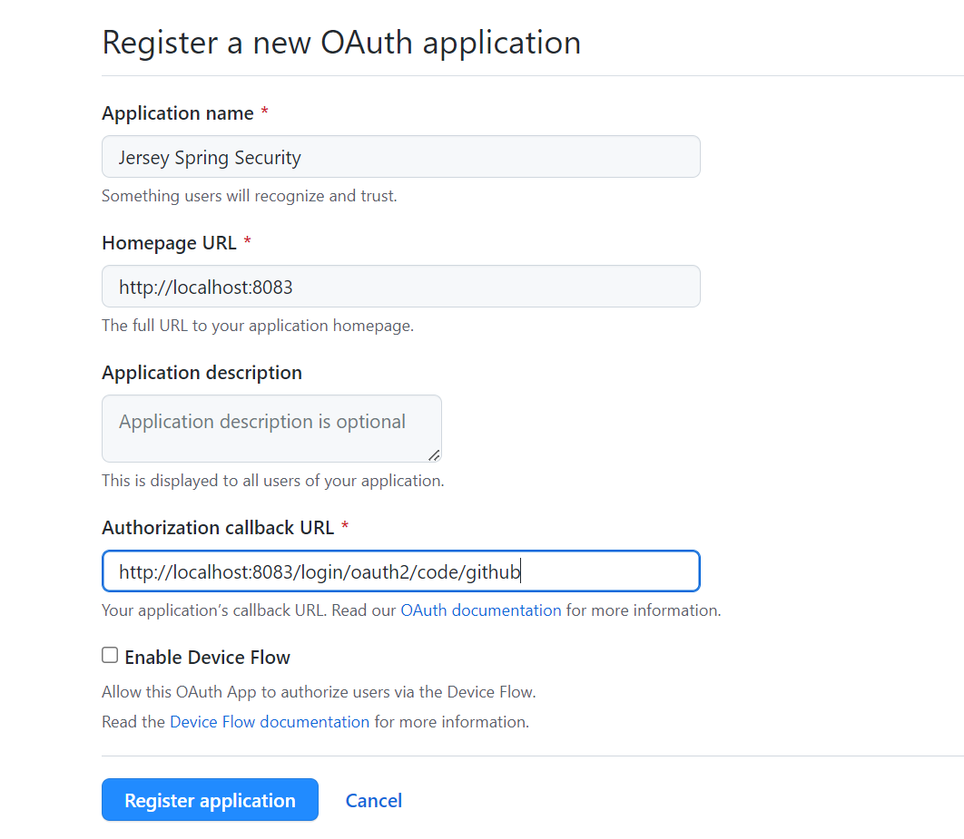 接下来,使用适当的值填写显示的表单。对于应用程序名称,输入任何使应用程序可识别的字符串。主页URL可以是http://localhost:8083,授权回调URL可以是http://localhost:8083/login/oauth2/code/github。